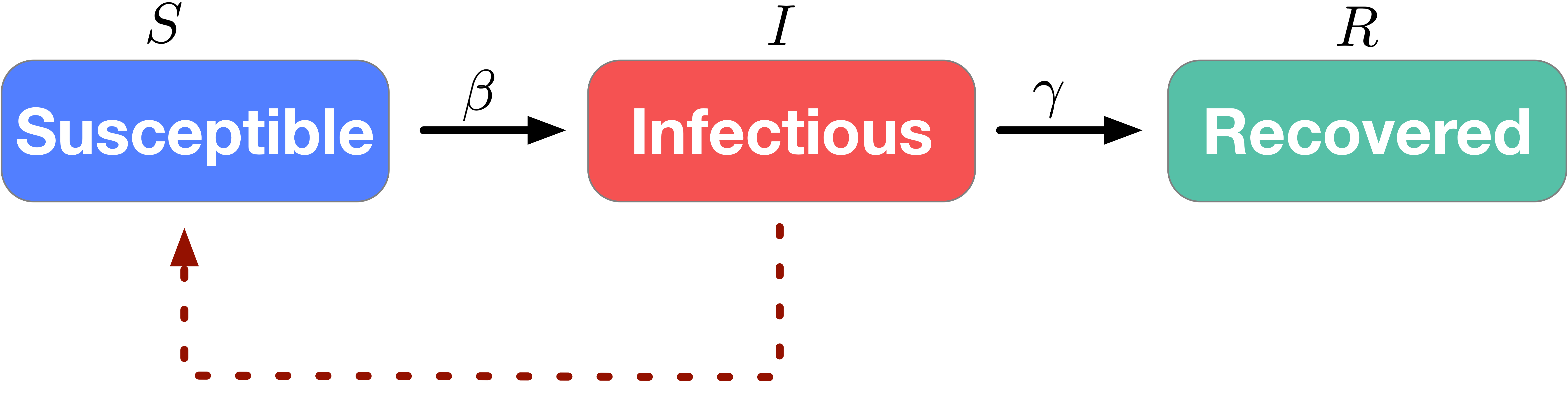 \[ \frac{dS}{dt} = -\beta SI\] \[ \frac{dI}{dt} = \beta SI - \gamma I\] \[ \frac{dR}{dt} = \gamma I\]