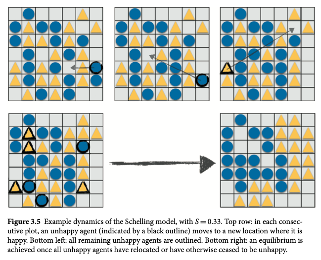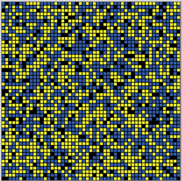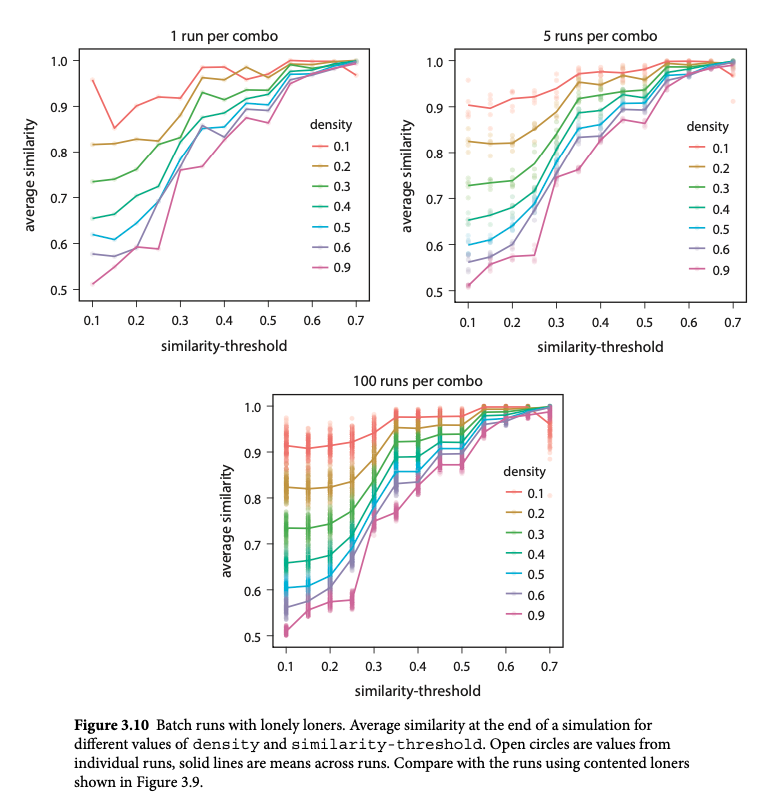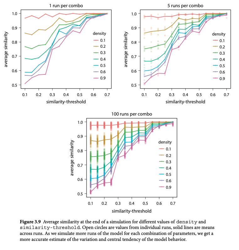 Snapshots of the model at equilibrium for different similarity thresholds and densities