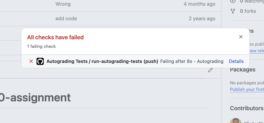 Click on Details to see information about what automated test failed. In this case, there is only 1 automated test, so if it fails your output is not what is expected.
