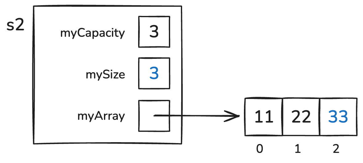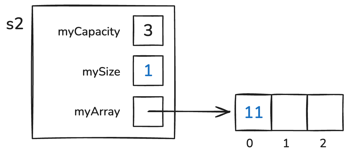 Item* myArray;We will be storing the address of a dynamically allocated array in myArray. We will be storing the length of that array in myCapacity, and in mySize, we will be storing the number of items in the array. As we shall see, this value will correspond to the index of the spot in that array where the next Item that we push() will be stored.
