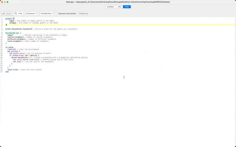 Also, to account for the happiness of the turtles, we will create a variable called happy? for each turtle. This variable will be a boolean (true/false) indicating whether the turtle is happy or not based on its neighbors. We also want to make sure each agent (household) can keep track of the number of similar neighbors, different neighbors, and total neighbors it has. This will help us determine if the agent is happy or not.